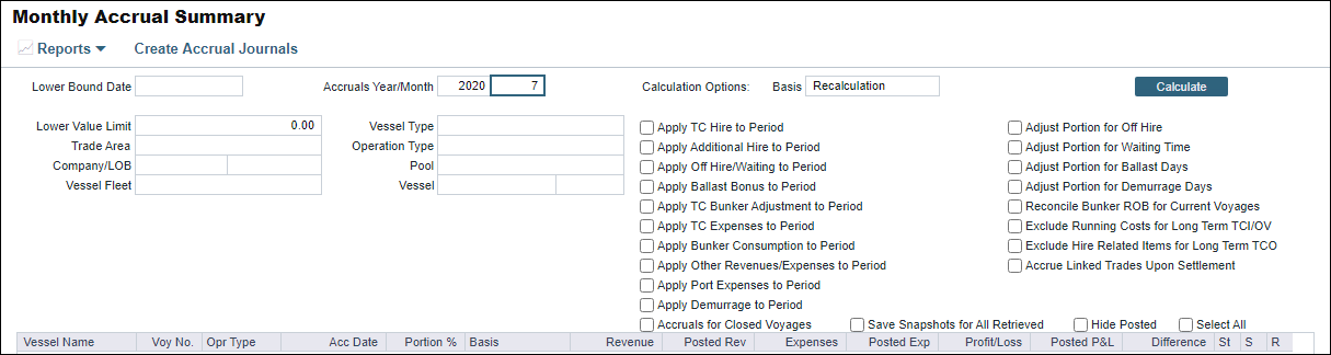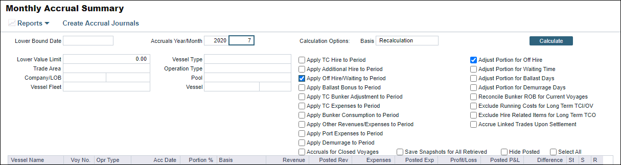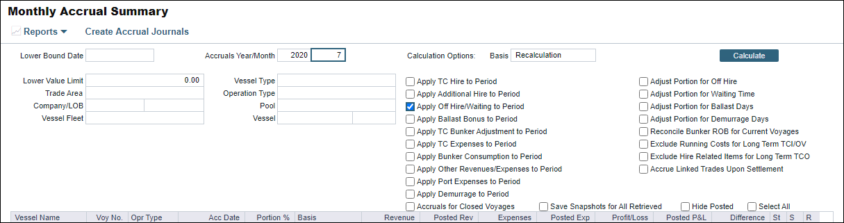 When it comes to reporting hire in the month-end accruals, there are four ways in which the system accounts and adjusts for off hire. Depending on the P&L Calculation Options chosen for off hire related calculations, the following are the four scenarios: