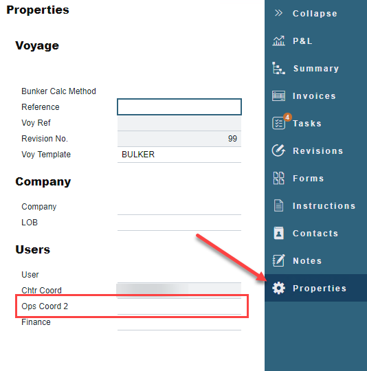 After enabling the above Configuration Flag, go to Voyage Manager > Properties and the Ops Coord 2 field becomes available for input.