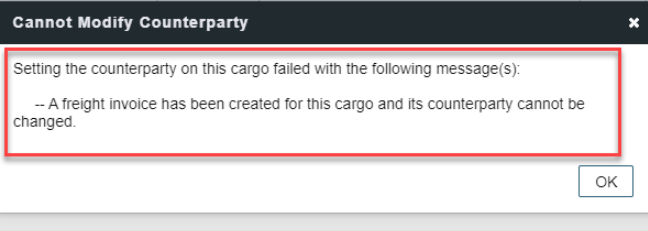 “A freight Invoice has been created for this cargo and its counterparty cannot be changed.”