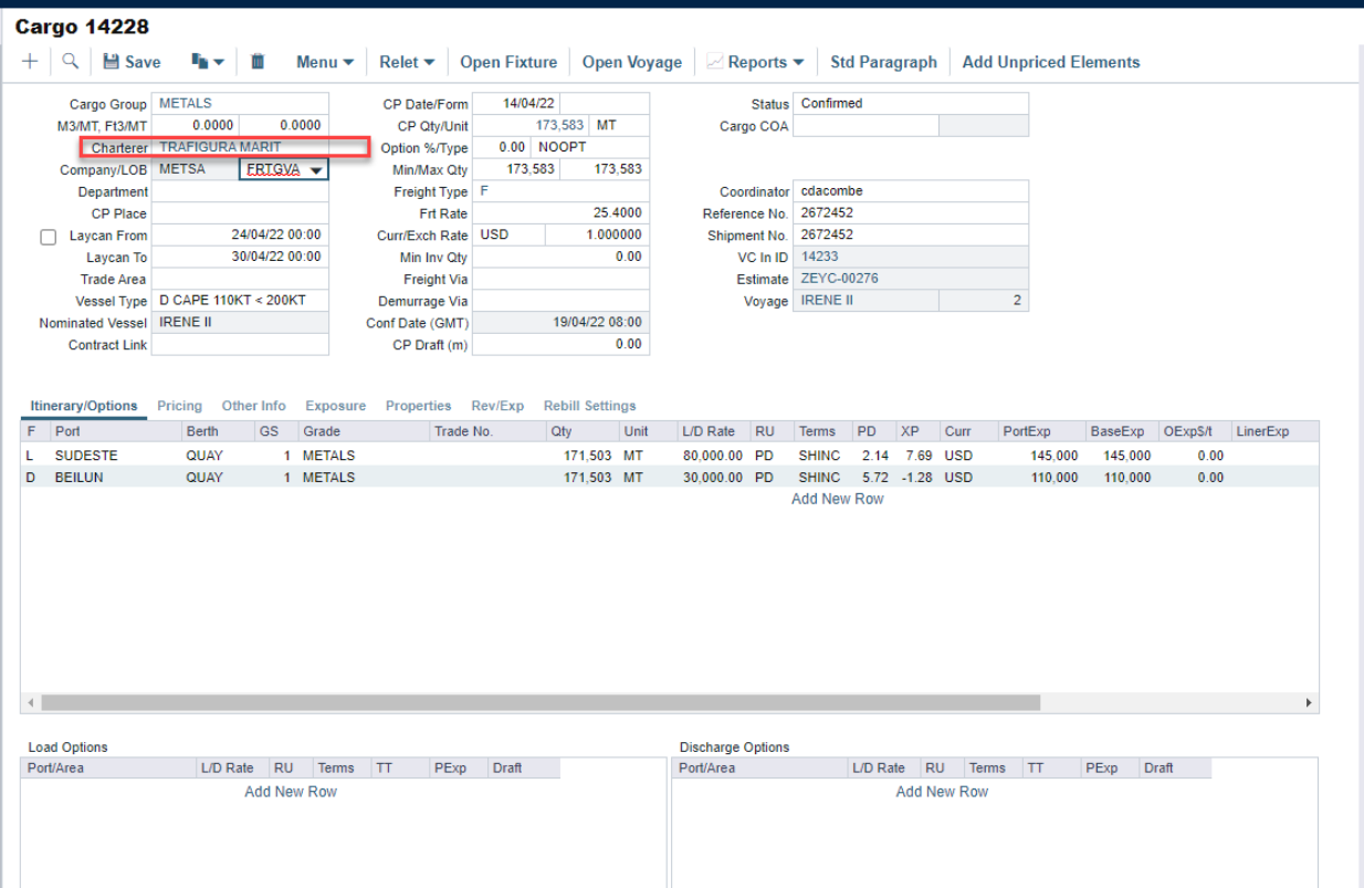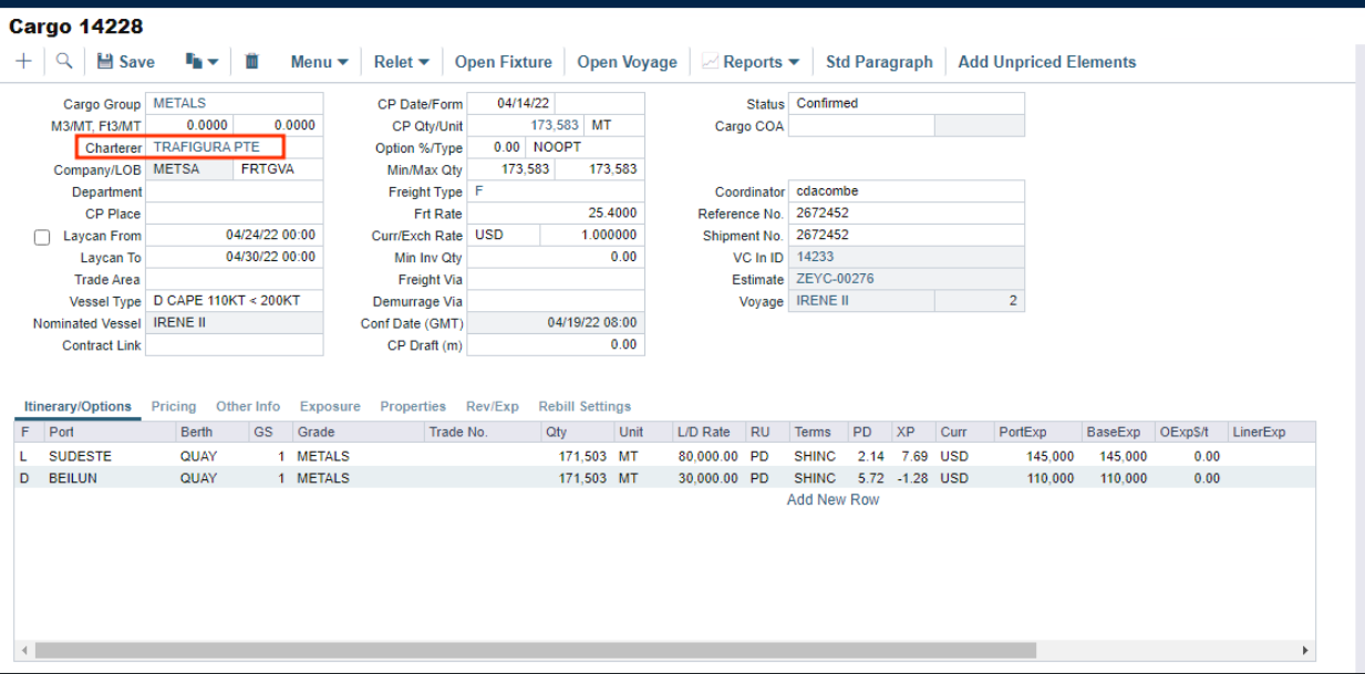 In the case below the user wanted to change the Counterparty (Charterer) on the cargo contract.