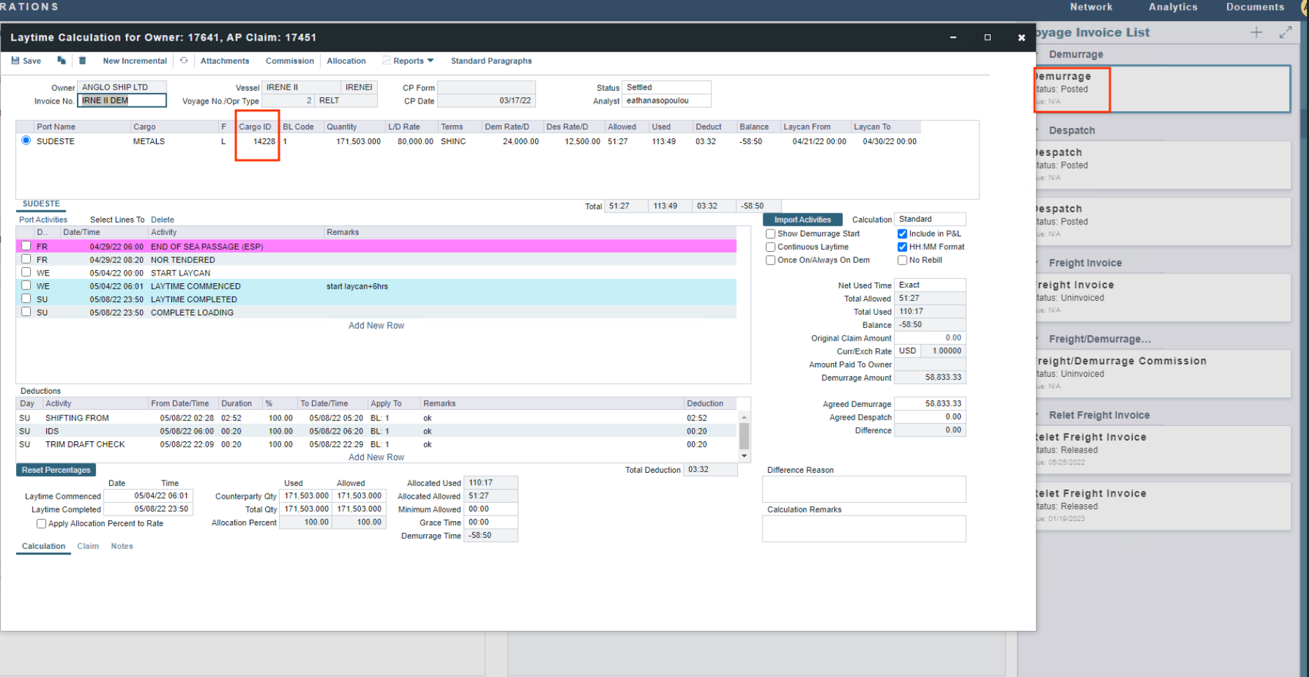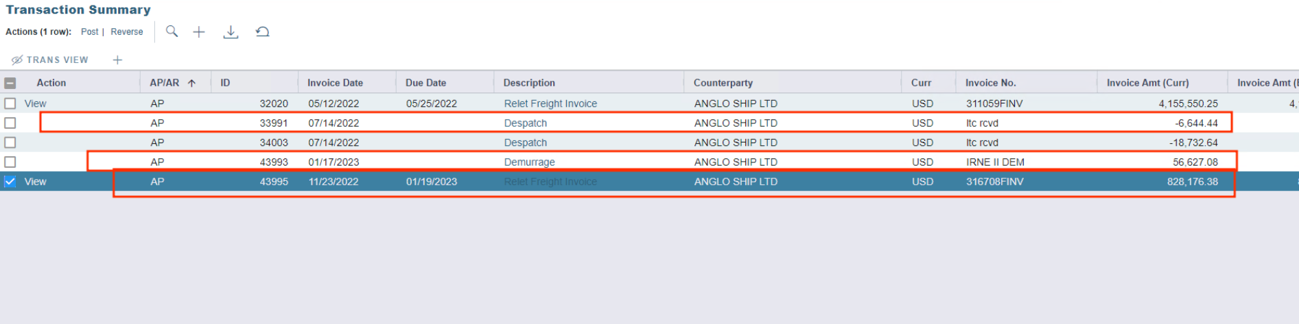 In order to reverse those two, the user needs to reverse the “Relet Freight Invoice” (transaction ID 43995).