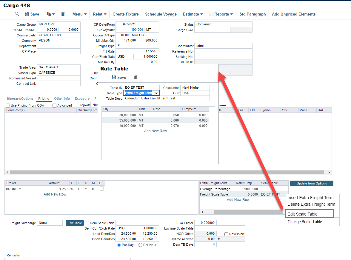 In the Cargo Contract's Extra Freight Terms grid, when a scale table value is populated, then the right-click dropdown menu will display two new values: