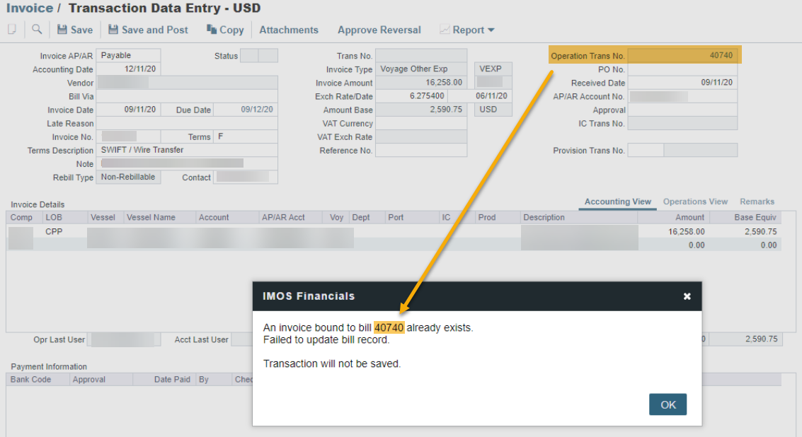 On rare occasions, bad data can be generated against the Operational side of an invoice. Trying to post the record will result in the below error message.