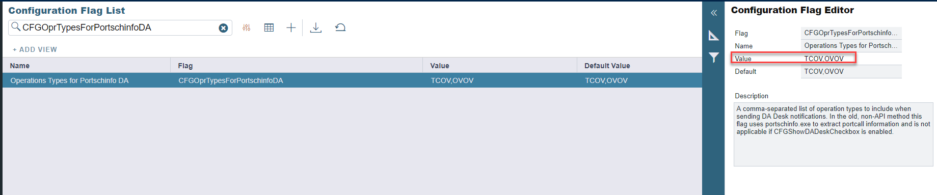 Configuration flag CFGOprTypesForPortschinfoDA controls the operation types to be included for DA-Desk notifications. The default flag values are TCOV& OVOV.