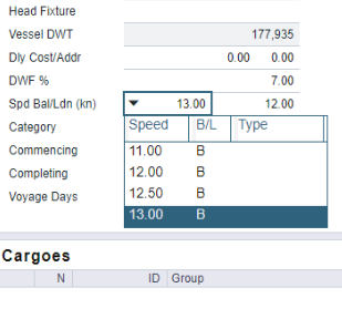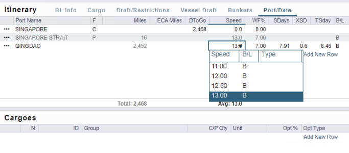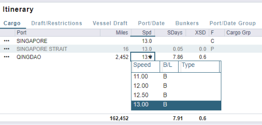 When the Restrict Speeds is enabled for a vessel type, entering vessel speed in the estimate and voyage itineraries will change from free text to dropdown fields. The options displayed in the dropdown field are the speeds defined in the vessel detail’s Speed Consumption table.