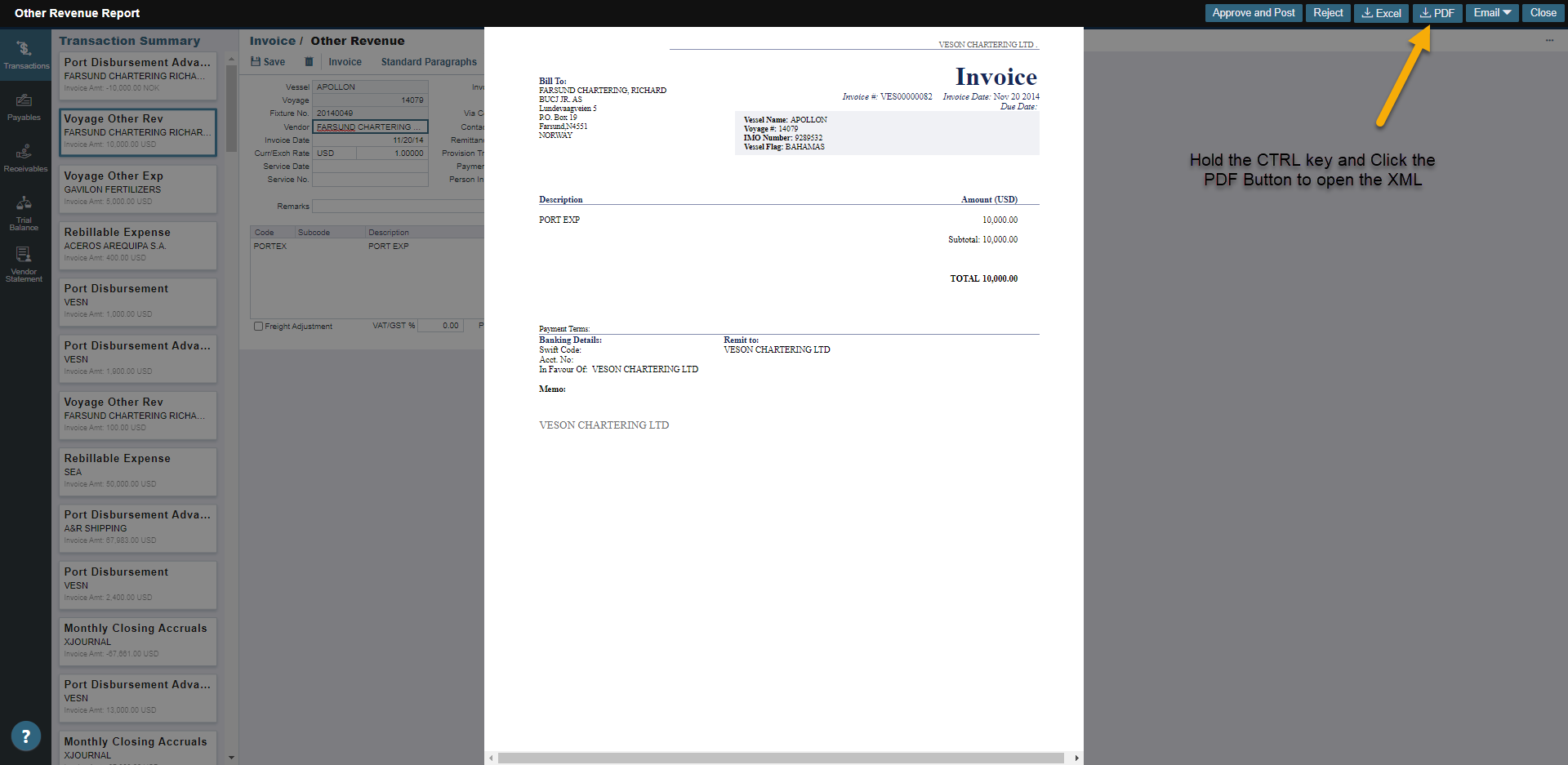 4. When the Invoice has populated in view as below; hold the CTRL key and select the PDF button.