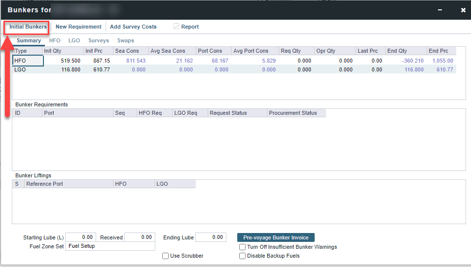 3. Go to Bunkers-> Voyage Bunkers-> Initial Bunkers