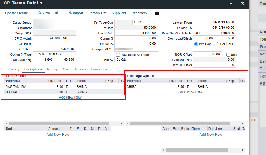 On the CP details on the “Itin. Options” all the possible loading and discharging ports must be defined.