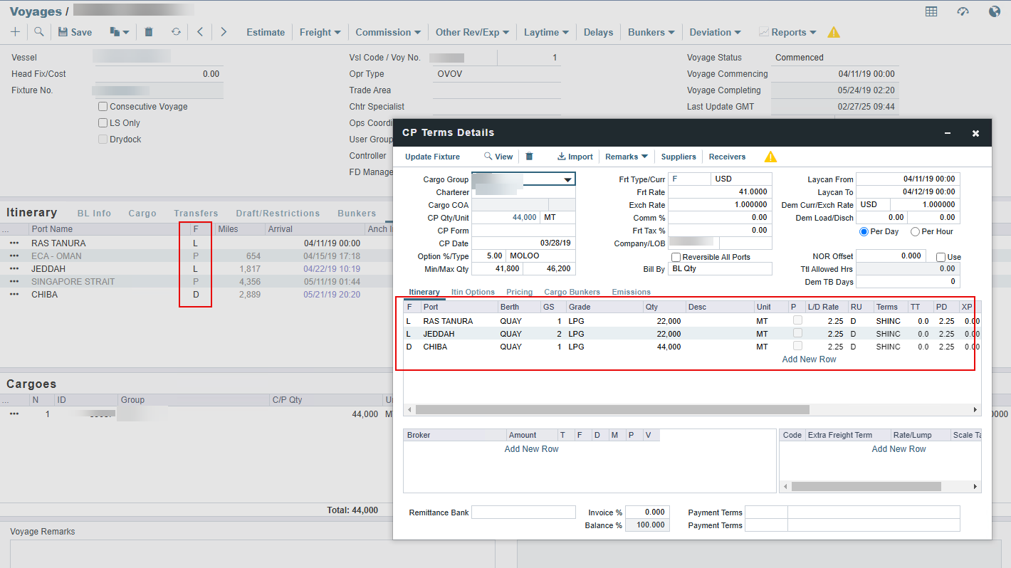 In the end, the system will automatically reflect the rate that matches the combination of what exists in the voyage's itinerary and what has been defined in the CP details
