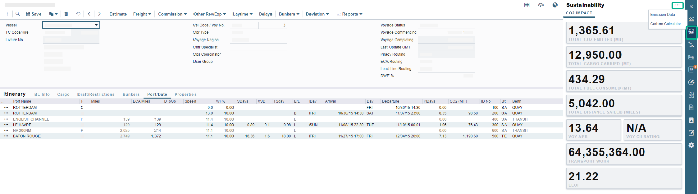 您可以从航程管理器(Voyage Manager)中打开碳排放计算器。如下图所示,在侧边栏菜单中选择可持续性(Sustainability)图标,并从下拉列表中选择碳计算器(Carbon Calculator)。