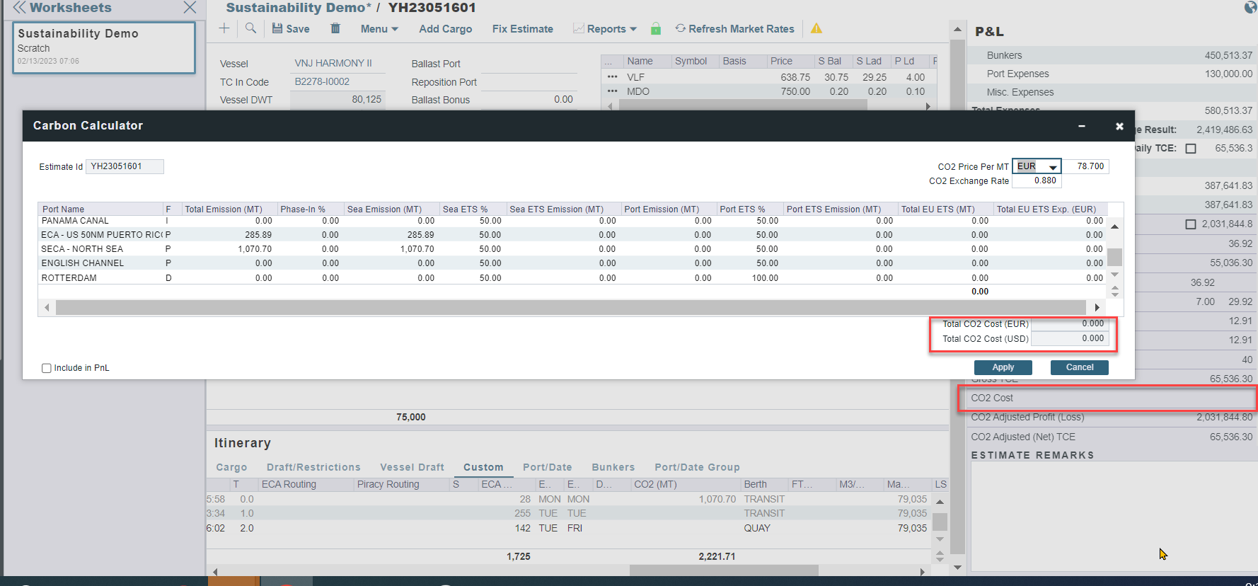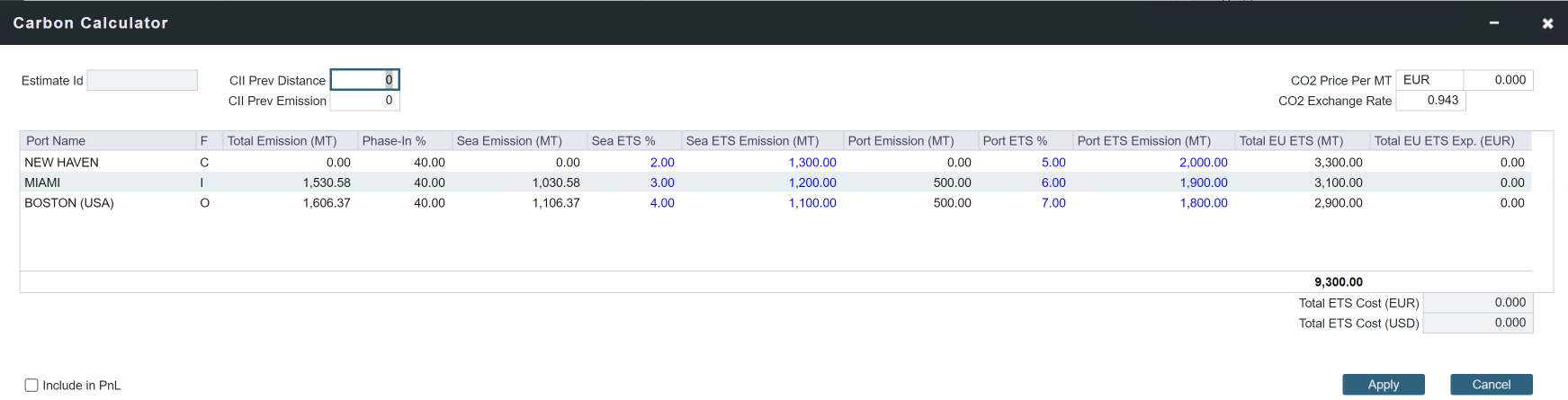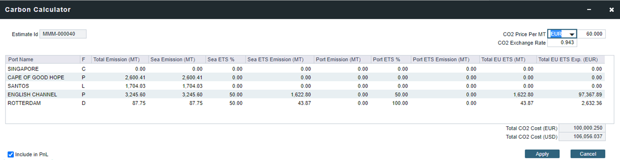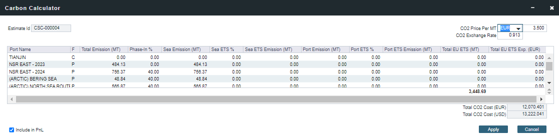您可以通过在碳定价表单中选择“包含在损益”("Include in PnL")复选框,将CO2费用包含在您的总航程成本中。一旦选定,排放量将在航次估算损益表(Voyage Estimate P&L)中显示为费用。