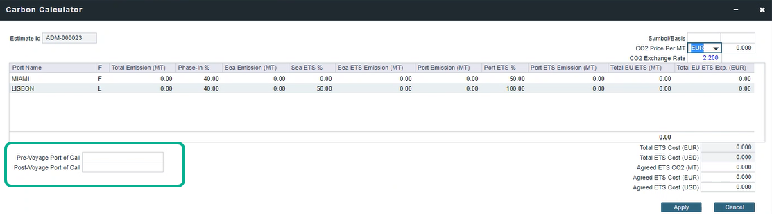 航次前停靠港(Pre-Voyage Port of Call)和航次后停靠港(Post-Voyage Port of Call)字段在航次管理器和航次估算器的碳排放计算器中,用于记录航次前后的船舶位置,并驱动正确的ETS百分比的计算。设置这些字段后,这些字段将影响海上ETS%和港口ETS%字段中的计算值。