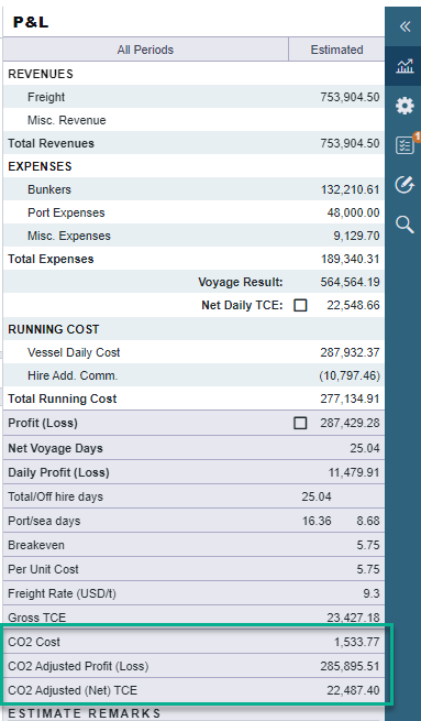 损益表将计算二氧化碳成本、CO2 调整后利润(亏损)和CO2 调整后(净)期租等值(TCE):