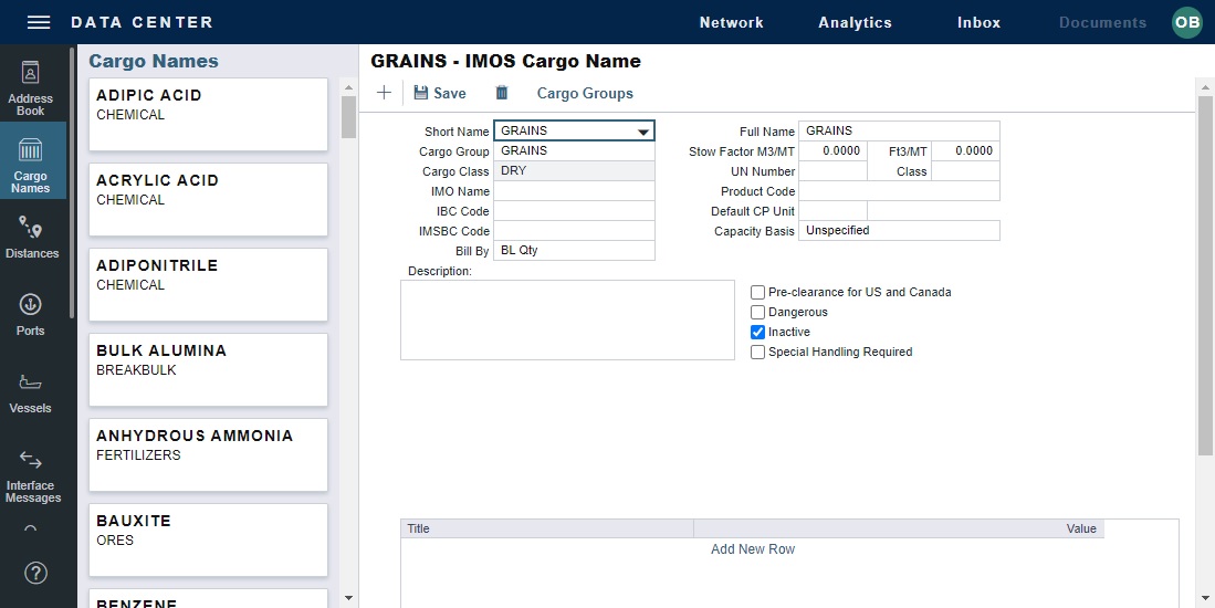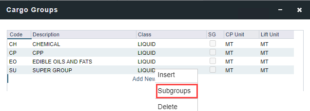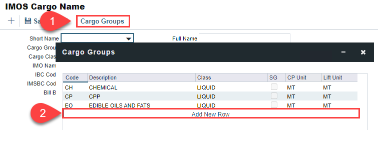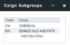 Add rows and select the existing Cargo Groups to be part of the Super Group. e.g., Chemical, and Edible Oils and FATS.
