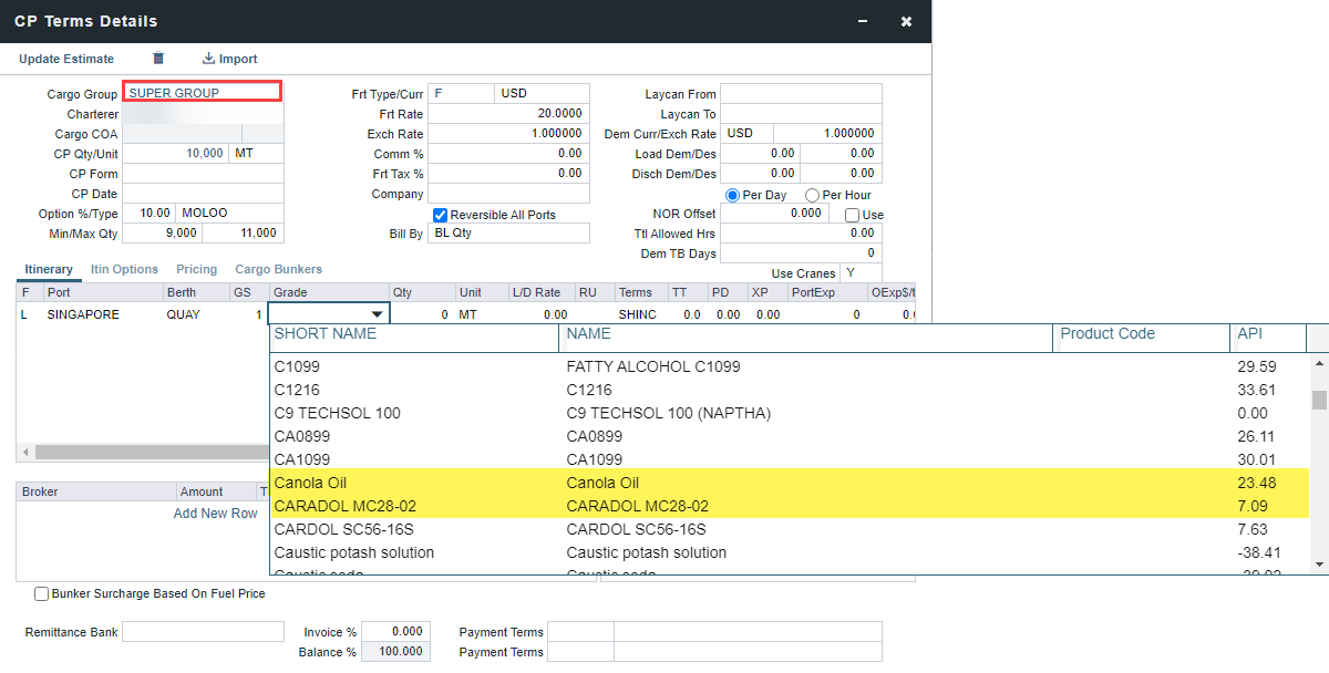 In Estimates, Voyage Fixture or Voyage Manager, when configuring the cargo on CP Term Details, select the Cargo Group name added as a Super Group. You can now select all cargoes in the Cargo Subgroups from the “Grades” column (e.g., Canola Oil is under the Edible Oils and Fats Cargo Group, and Caradol is under the Chemical Cargo Group).