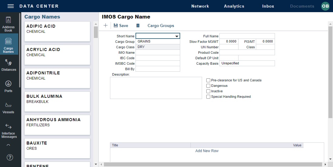 The Cargo Names workspace enables you to enter the name and information for each type of cargo.