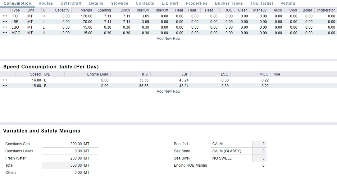 Fuel Types: The Fuel Type columns will pull from the lines in the In Port Consumption table, and the values represent the consumption rate for that specific fuel type based on the designated speed.