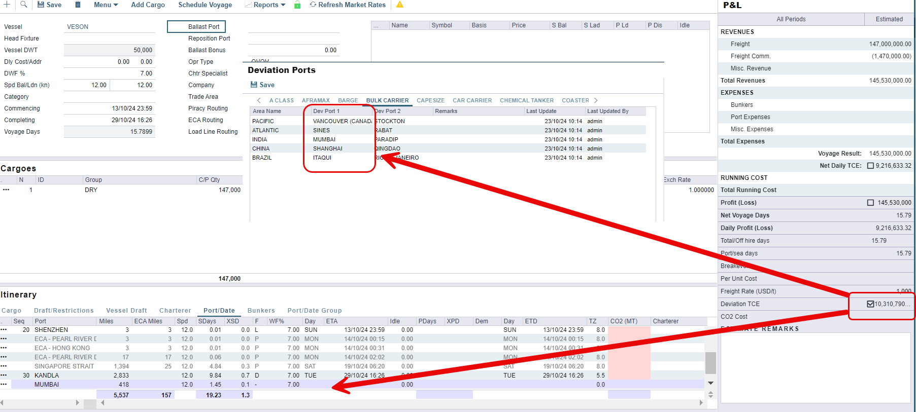 This is not to be confused with Deviation Estimates which allow clients to duplicate an active voyage to assess the P&L impact of deviating from the current voyage plan. It provides a way to modify the connected voyage by adding cargo contracts, enabling clients to evaluate whether the proposed deviation would be beneficial.