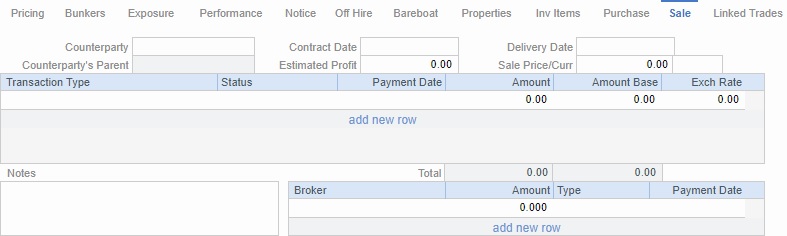 It has Purchase and Sale tabs; on each, the counterparty, payment terms, broker information, and other relevant data can be recorded.