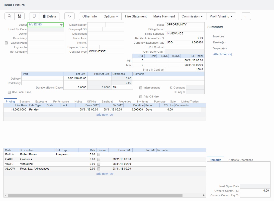 Creating a Time Charter In contract for a vessel with ownership type OV defaults the Contract Type to be Own Vessel, with the owner and the company from the Vessel form. A contract of type Own Vessel is a Head Fixture.