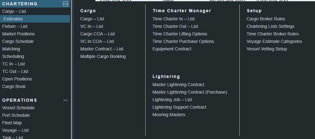 The following menu types appear to help you navigate through the Veson IMOS Platform:
