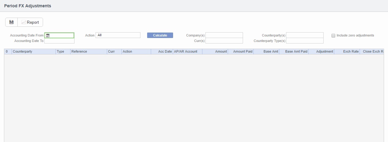 Click to calculate the adjustment. A list is generated of all invoices with a zero invoice currency balance and a non-zero base currency balance.