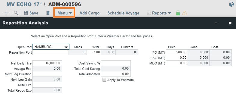 The Reposition Analysis helps you calculate the cost of a reposition voyage and allocate some of the cost to the current Voyage Estimate, as a reduced loss.