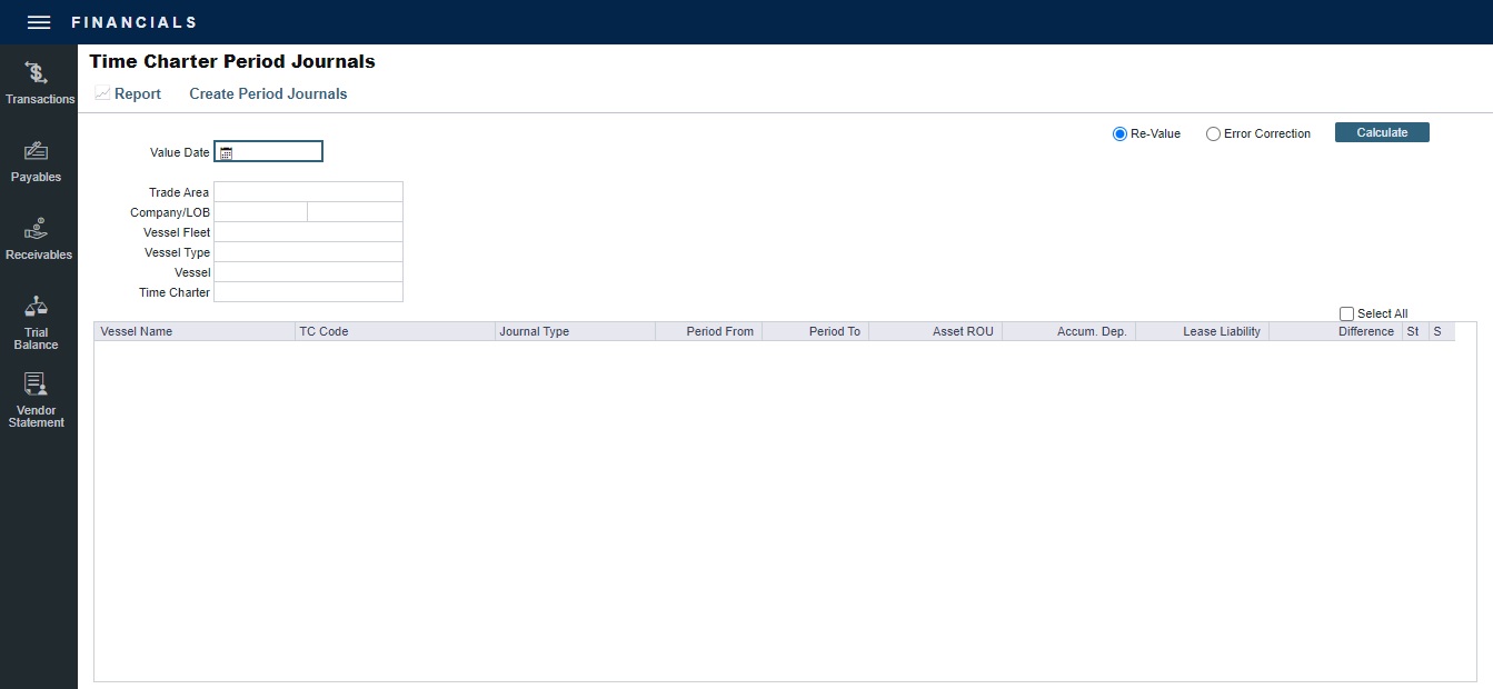 On the Financials menu, under Period Closing, click Time Charter Period Journals.