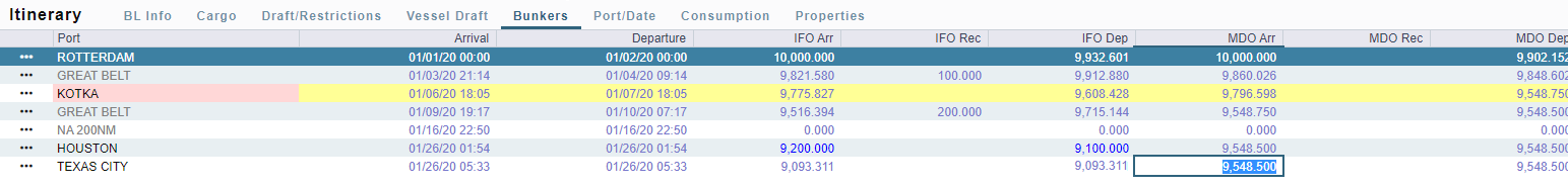 If any quantities for a port call are estimated, the Cargo ROB value for this port will be blue.
