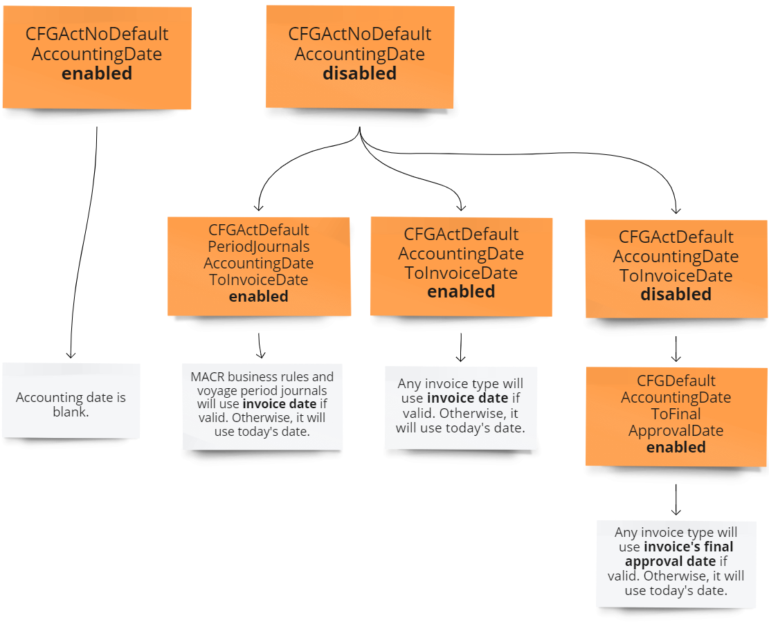 When the configuration flag CFGActNoDefaultAccountingDate is enabled, the accounting date will not have a default value when you post invoices and journals. This flag takes precedence over all other accounting date default configuration flags including CFGActDefaultPeriodJournalsAccountingDateToInvoiceDate and CFGActDefaultAccountingDateToInvoiceDate.