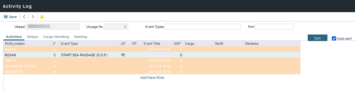On the Activity Log, you can record and view voyage activities, including Delays, Cargo Handling, and Heating information. You can use the Activity Log or the Port Activities form interchangeably. Activities and information added to the Activity Log are synchronized with the Port Activities, Delay, and Cargo Handling forms.