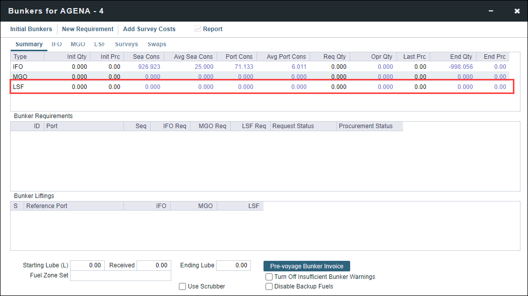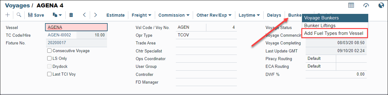 Once a new bunker type (e.g. LSF) is added to a Vessel and saved, return to the voyage and click on Bunkers > Add Fuel Types from Vessel.