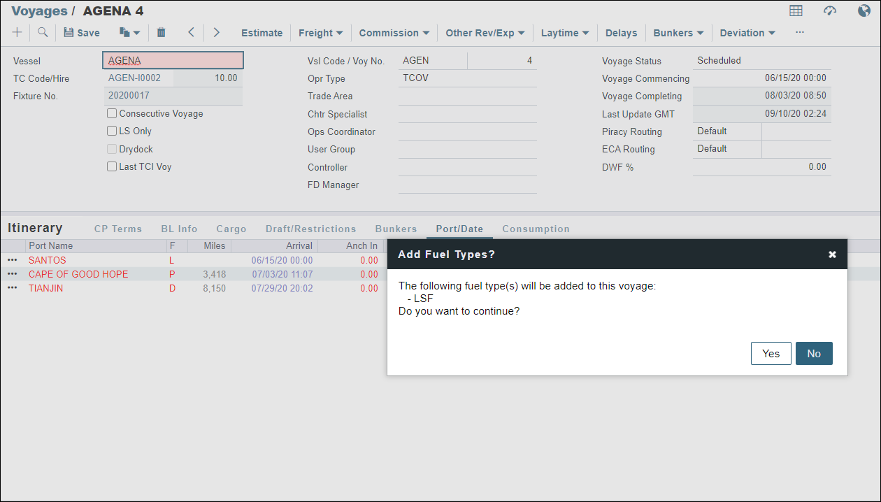 Return to the voyage that you want to add the new bunkers to and perform the steps in Adding New Bunker Types to a Voyage.