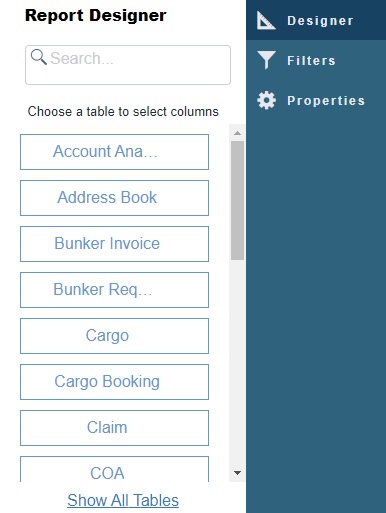 Note: To see all tables in the Report Designer, click Show All Tables.To add columns, use any of these methods from the list of fields in the Report Designer panel: