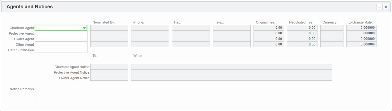 Charterer, Protective, Owner, Other, or Data Submission agent name: Selection lists display agents marked as servicing the port first. The selected agent's contact information appears.