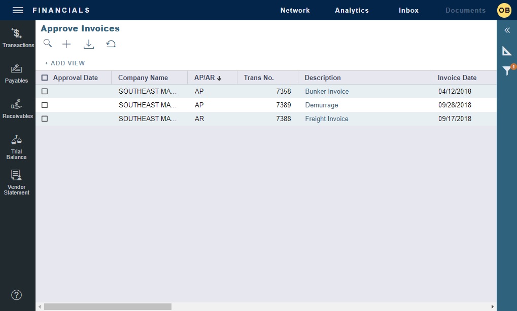 Enable specifying the number of approvals required for nonvoyage invoices. After an invoice has been approved, if it should be approved at least once more, its status is Partially Approved, and the last Approval User is in the Approval User column. An additional column, Approval User 2, is available in the Financials lists.