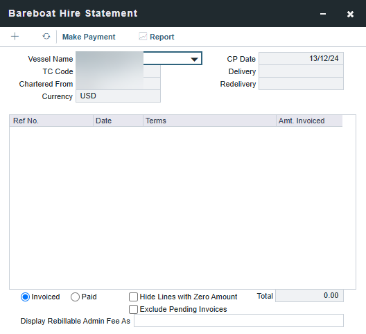 The Hire Statement for a Bareboat contract lists all the amounts invoiced or paid; you can make a payment from it. You can also view reports.