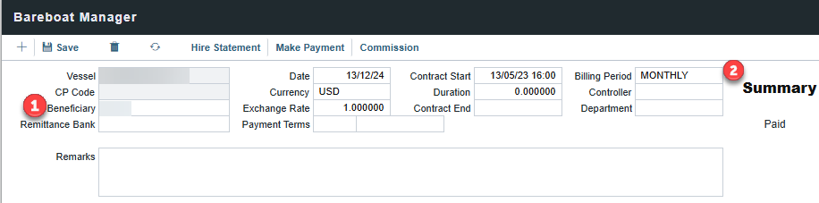 On the Bareboat Manager page, enter the Beneficiary (the Date, Currency, and Contract Start will automatically fill in) and the Billing Period.