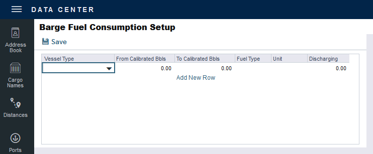 On the Barge Fuel Consumption Setup form you can set fuel consumption rates during discharge for barges of different capacities. Consumption values are set in gallons of fuel per hour, depending on the size of the barge. In other words, barges in size from (From Calibrated Bbls) to (To Calibrated Bbls) consume (Discharging) gallons per hour of (Fuel Type).
