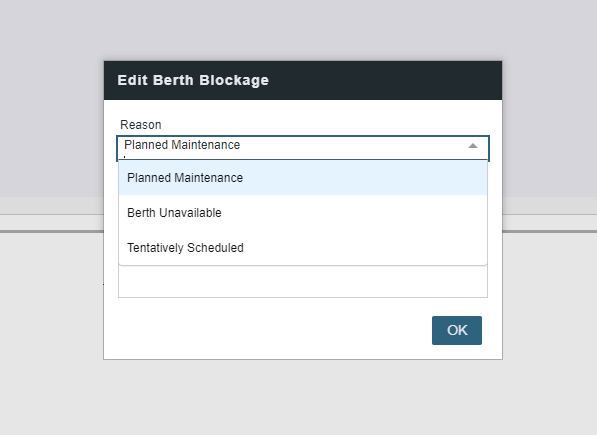 Once the block has been created, click the block to edit the length of the block, the default reason (Planned Maintenance, Berth Unavailable, Tentatively Scheduled), and add Notes.