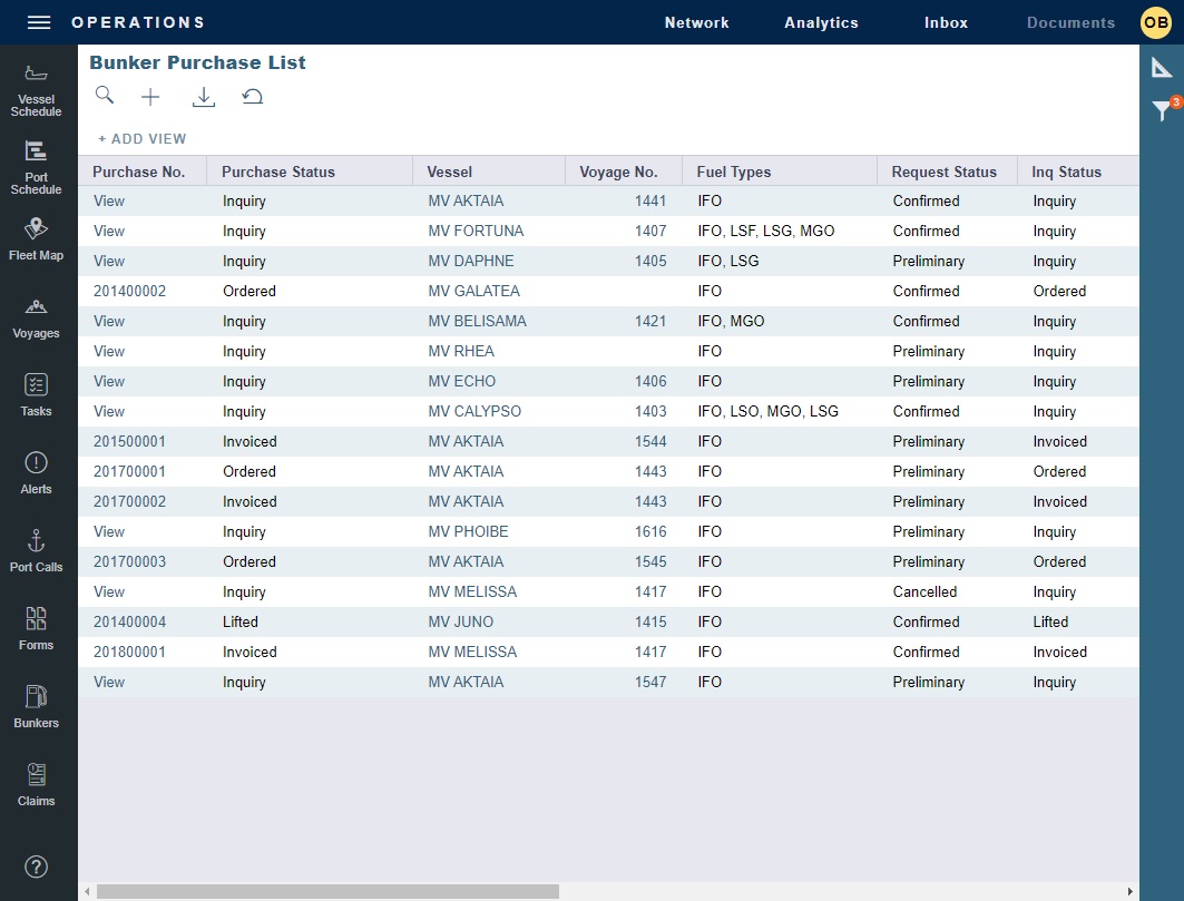 See historical data regarding inquiries and purchases per port, per vendor, or per fuel type, to compare costs and performance at different ports and with different vendors.