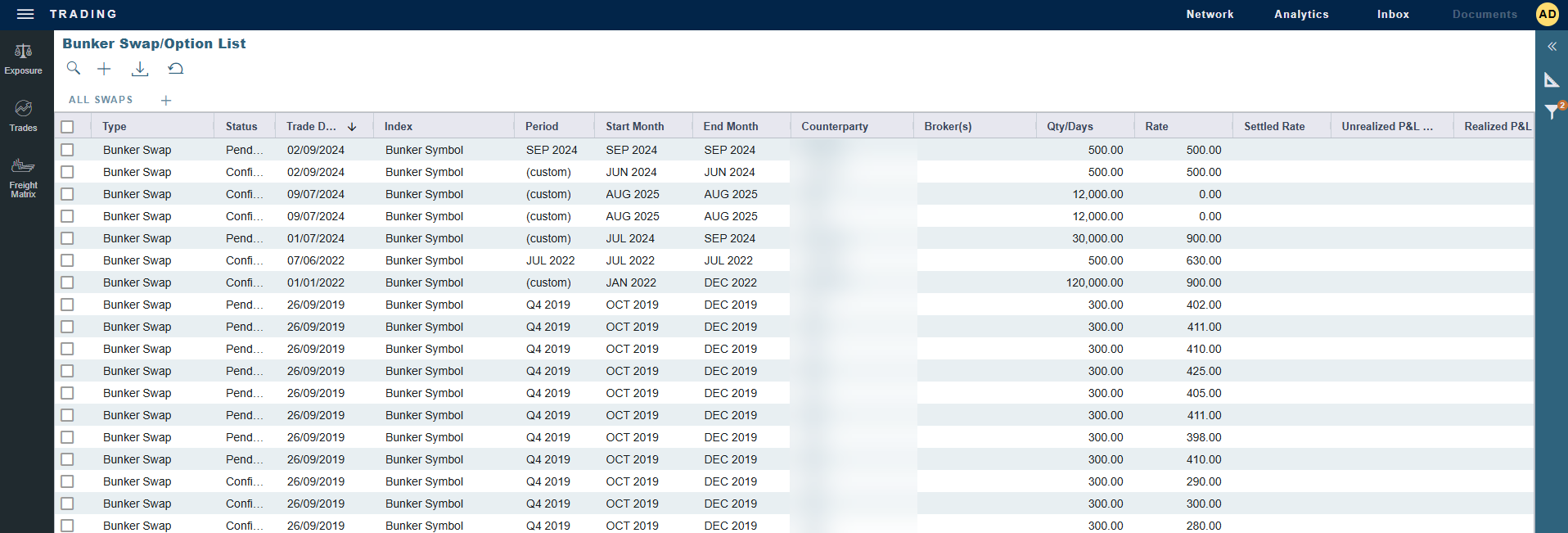 The Bunker Swap/Option List includes all Bunker Swap/Option Trades that you have the right to view.