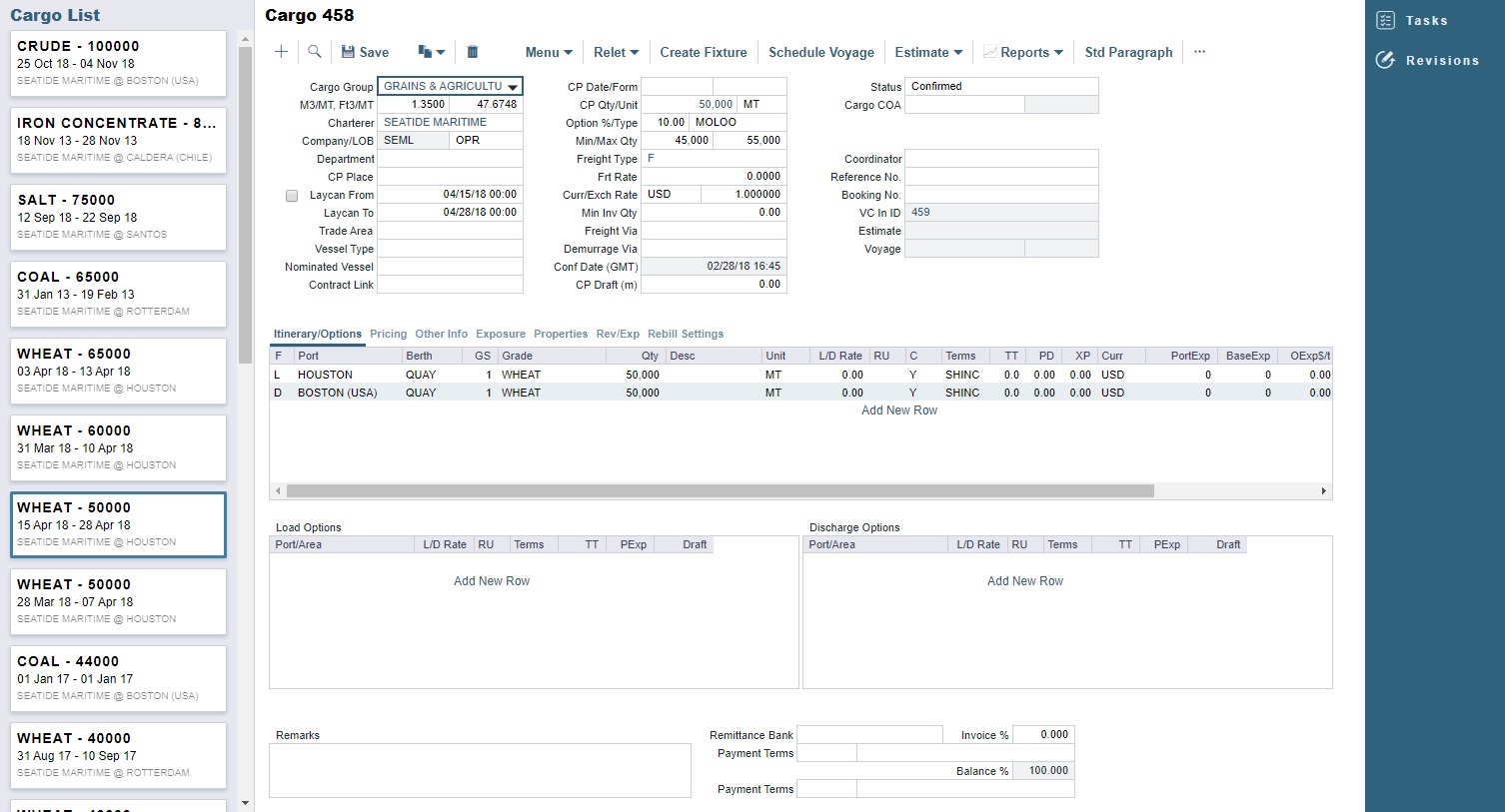 To create a Voyage Fixture from the Cargo, click Create Fixture. All the information from the Cargo moves to the Voyage Fixture and then to the voyage.