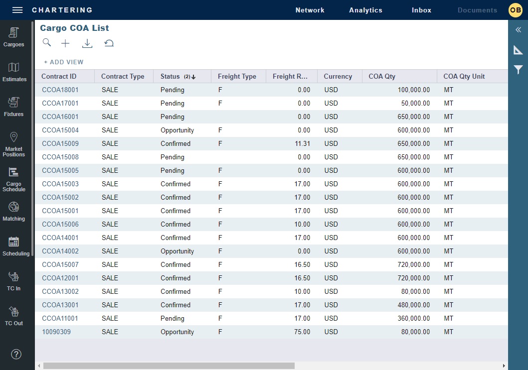 On the Chartering menu…, under Cargo, next to Cargo COA, click List.
