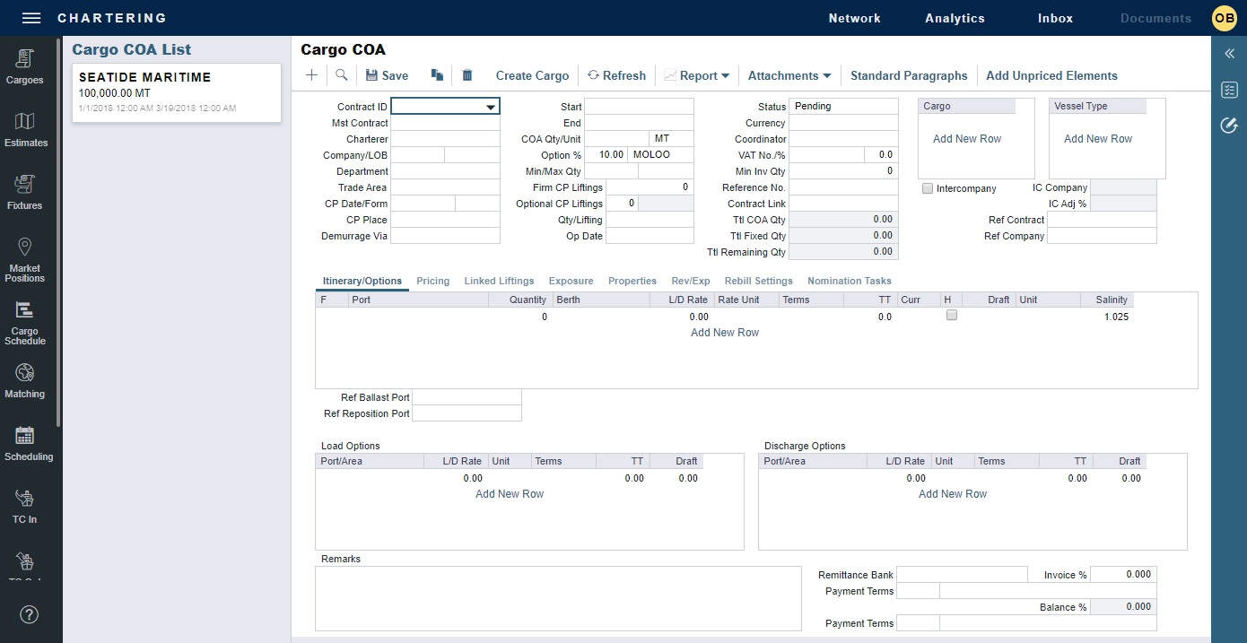 When you need to set up a contract agreement to move a certain amount of cargo over a period of time, you can use a Cargo COA, or Contract of Affreightment. A Cargo COA is like an umbrella contract that might include several different cargoes and several different load and discharge ports, each with its own terms and costs.