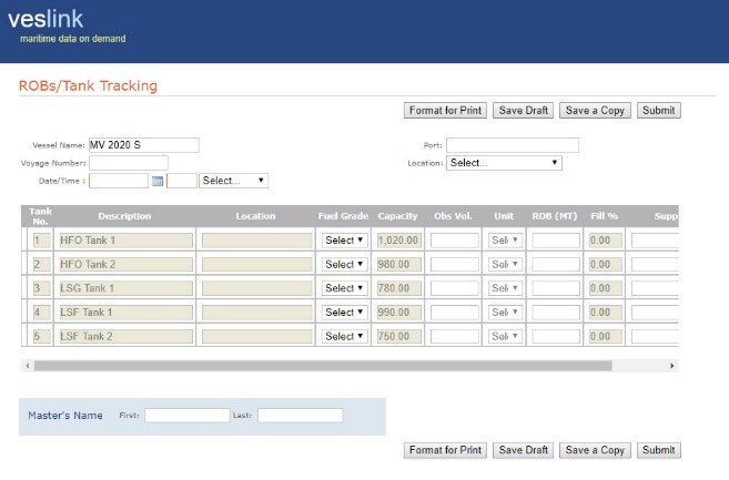 At the vessel level, Bunker Tanks can be specified, including capacity and unit. When using Voyage Reporting to collect Noon/Arrival/Departure reports from the vessel, these values populate a Bunker Tanks table, allowing entry of ROBs by tank and Fuel Type.