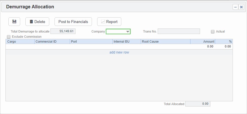 You can allocate a Demurrage amount to different internal business units. To create a new Demurrage Allocation: