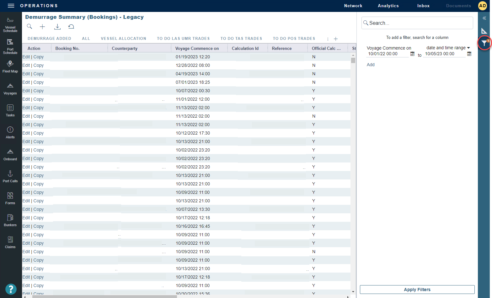 The Demurrage Summary (Bookings) list only loads the most recent year of data in the Veson IMOS Platform by default to be performant. To load data in the list that is more than a year old, follow these steps: