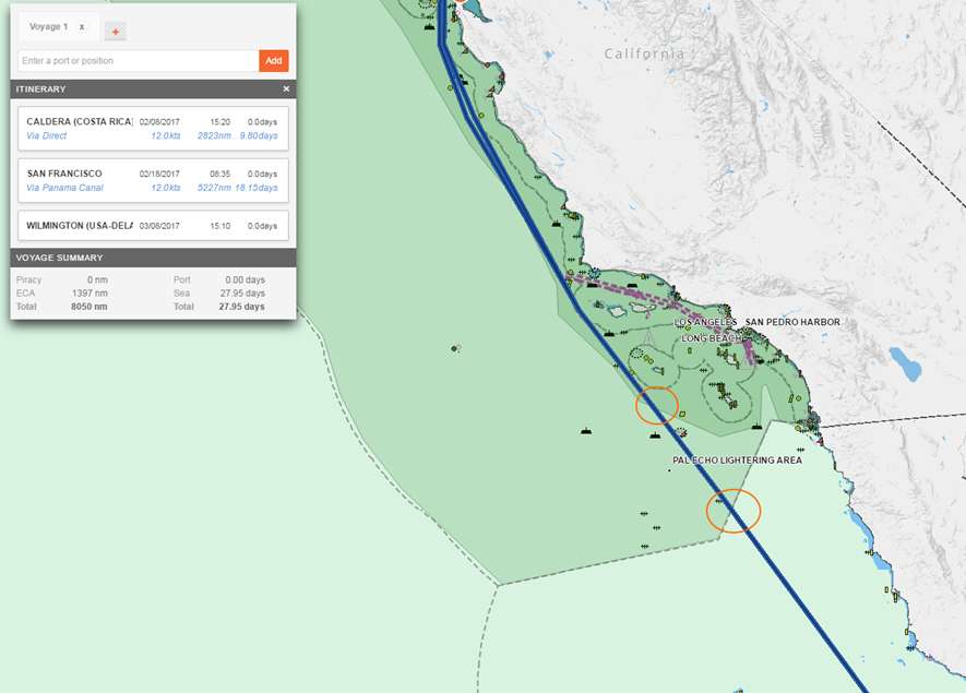 Finally, there is no ECA zone shown en route to Wilmington. This is because there is no transition between ECA zones. The vessel enters NA 200NM once, but never transitions into another ECA zone; hence there is no display of a passing point from there.