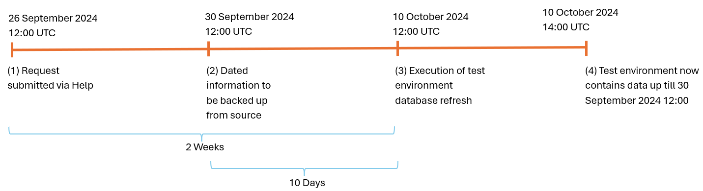 If the test environment needs to be refreshed with production data up until 30 September 2024 at 12:00 UTC, and a request is submitted on 23 September 2024 at 12:00 UTC, the earliest execution time, considering the two weeks' notice, will be 7 October 2024 12:00 UTC.
